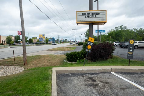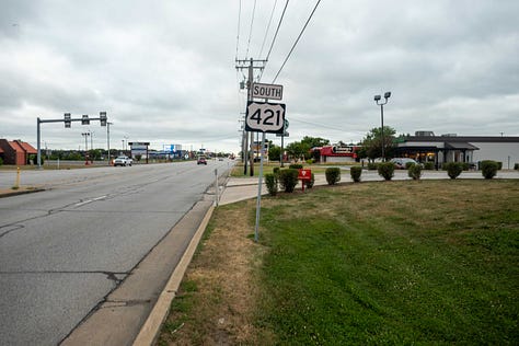 I thought of the story while walking in Michigan City, the small commuter town I rested in for four days following my Greyhound trip. Each day I awoke at five a.m., walked the mile from my room to the downtown McDonald's, then another three to the McDonald's out past the busy bypass. Almost my entire trek, there and back, was on the very straight five-lane Franklin Street.