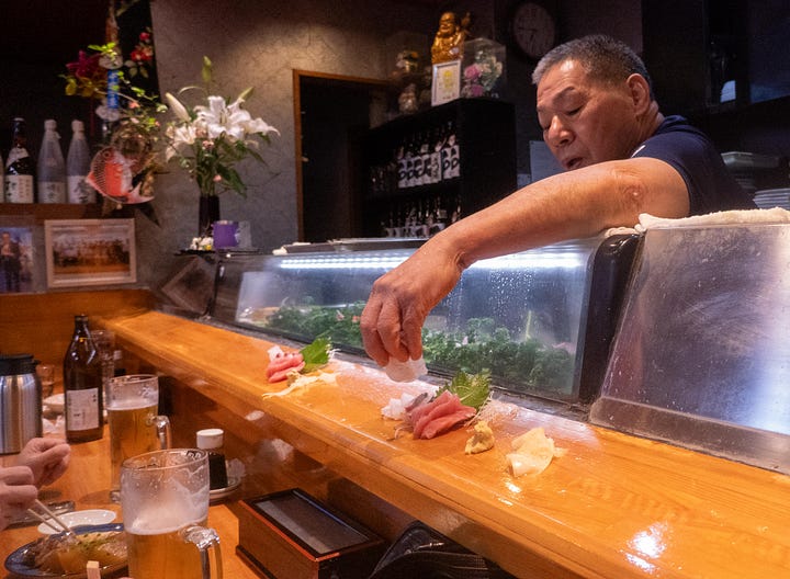 I liked the small sushi restaurant in the bottom floor of a home, with the waitress wife, sushi-chef husband, and grandfather who must have been close to a hundred, who between doing odd jobs (sweeping the floor, caring for plants, clearing tables) kept a steady stream of commentary on whatever was playing on the TV. That included that evening a report of the prior day’s meeting between Trump and their prime minister, Sanae Takaichi, a meeting where Trump made a joke about Pearl Harbor, which had brought a great deal of scolding on U.S. social media about being offensive, but here brought a round of exaggerated thumbs ups directed at me from both the grandfather and a drunk customer in the corner, who shouted, “I love Trump. He’s strong. America good. You love Trump?”