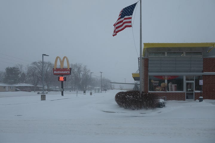 I’m writing this from a McDonald’s in Northern Indiana, blasting top forty (oh-ee, Makeba, Makeba ma qué bella, Can I get a “Ooh-ee”? Makeba, Makes my body dance for you) as it snows another four inches outside. It wasn’t supposed to snow today, but four inches of snow when it wasn’t supposed to snow has been the normal for the last week.