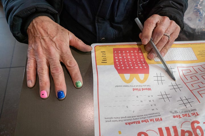 I've adopted this McDonald's, a mile walk from my room, and so I know everyone else currently in the dining room. That includes the four men, each in their respective nests, who all live precarious but regimented lives devoted to drugs, either mandated or illegal.