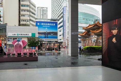 All Chinese cities are remarkably similar; that, after all is the goal of the party, which is to modernize away the messy, embarrassing past, and the blueprint for those aspirations is place-independent. It is a communist’s capitalism, a shared embrace of material wealth that doesn’t favor any one location — all of China is in this together, so all of China will look alike because all will benefit from this new world of immaculate metros that whoosh you from your thirty-story apartment building to the lustrous eight-story mall, the ones bedazzled in lurid lights, garish signs, and three-floor-high jumbotrons flashing sexy models, for a night of shopping, rock-climbing, and hotpot with your friends.
