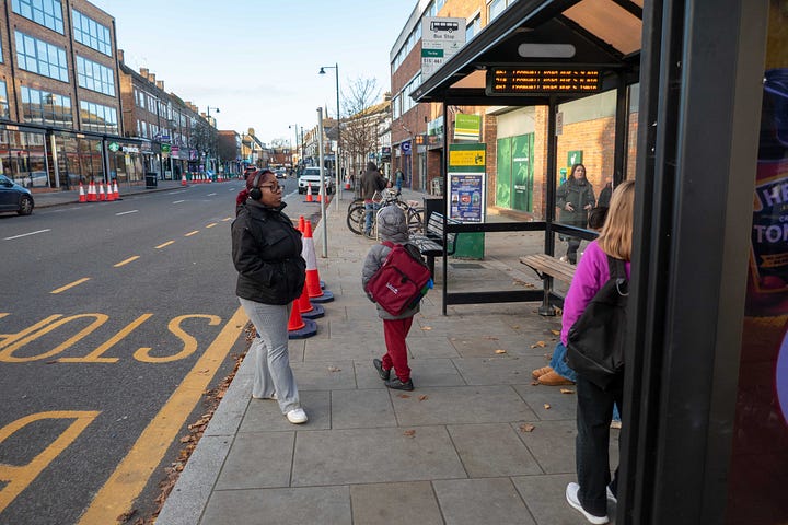 The next morning was even more maddening, when the twelve-mile bus trip from my Weybridge hotel to Kingston, where I would begin my walk, became a two-hour festival of frustration. I waited an hour in the cold with a mother and her very patient child, as its advertised arrival jumped randomly between thirteen and six minutes, before it finally disappeared entirely. When the bus eventually came, without warning, it was close to full, and with only one door, each stop became a game of human logistics, as people shuffled, shifted, and climbed over each other, to make space for those both leaving and coming. That didn’t stop the driver from combining our sloth bus with the next slightly less sloth-y one when it caught up with us, forcing us all onto a single bus.
